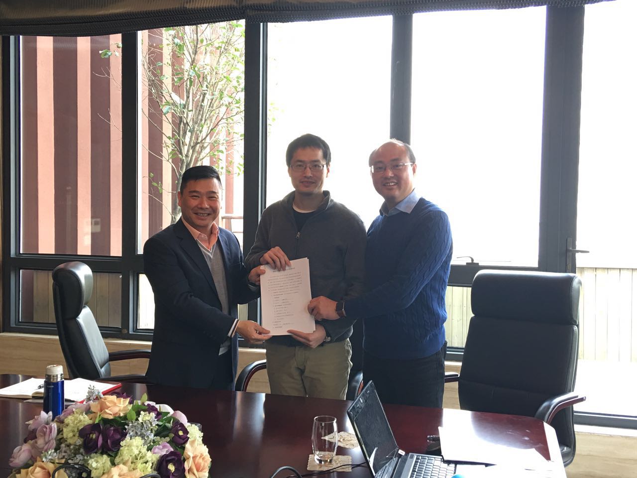 图为集团董事长兼总裁赵增杰与集团副总裁俞春军、信息科技公司总经理姚逸涛签约