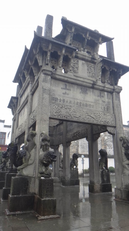 安徽黄山市歙县古城许国石坊(又名大学士牌坊)俗称大学士八角牌楼。八角牌楼建于明万历十二年,牌坊石质为茶园青石,有八根柱子,口字形平面,南北长11.56米,东西宽6.77米,通高11.5米,南、北二面作二柱三楼式,东西二面作四柱三楼冲天柱式,结构稳固,造型丰满,是古徽州石牌坊中的代表之作。据了解, 1988年,这座“许国石坊”被列为全国重点文物保护单位。