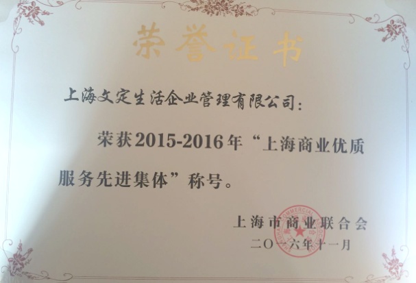在这次以“诚信兴商”为主题的上海商业创先争优评选表彰活动中,上海文定生活企业管理有限公司获得“2015-2016年上海商业优质服务先进集体”荣誉称号。