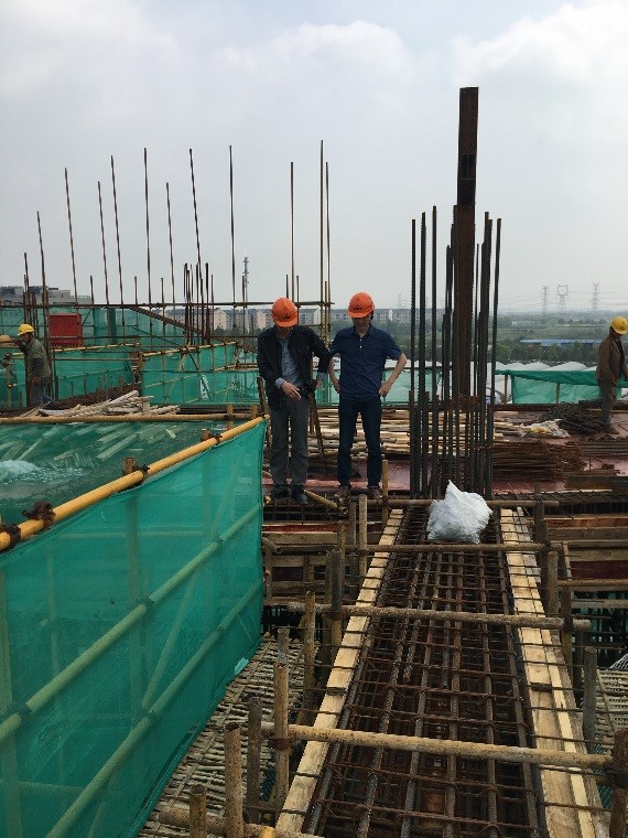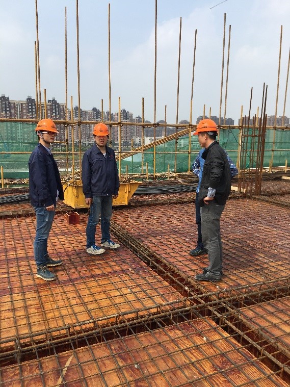 首先大家在技术部刘经理、质量部沈经理的带领下,深入一线施工现场,对1#楼部位的高支模、轨行区上方混凝土结构梁施工的操作平台、防曲屈支撑、劲性钢结构柱梁复杂节点以及交叉施工保护措施等方面作为重点进行实地介绍、观摩和交流学习。