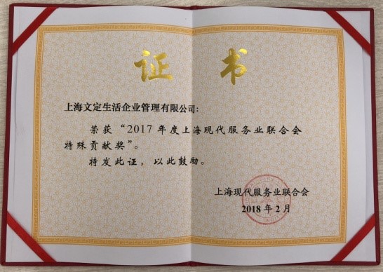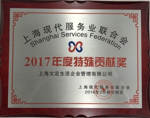 2月28日,上海现代服务业联合会第三届理事会在上海国际会议中心隆重举行,大会对2017年度为推动现代服务业发展作出贡献和取得优良成绩的会员单位进行了表彰。上海文定生活企业管理有限公司获大会颁发“2017年度上海现代服务业联合会特殊贡献奖”,这是文定生活暨2013年获奖后再度荣获该奖项。